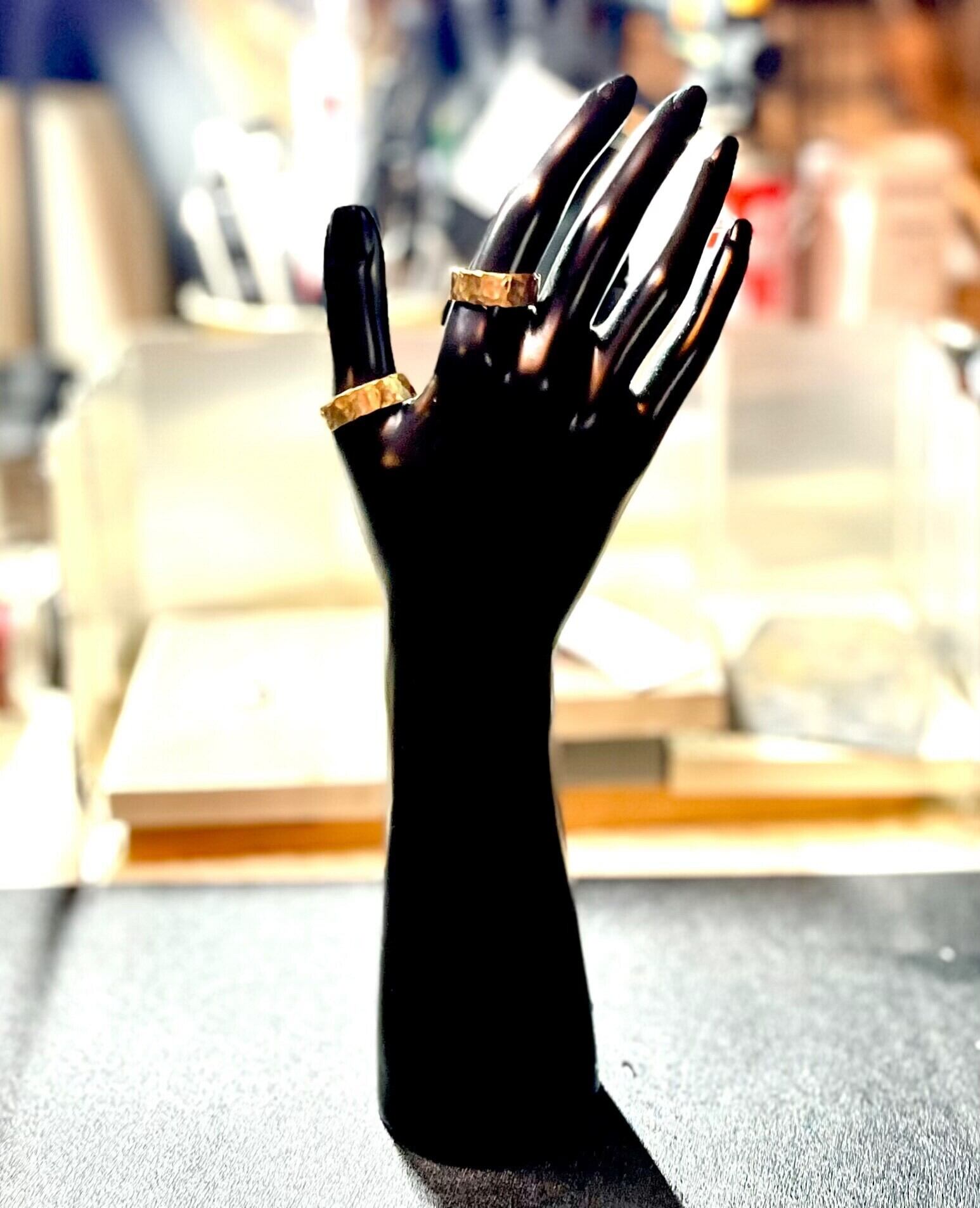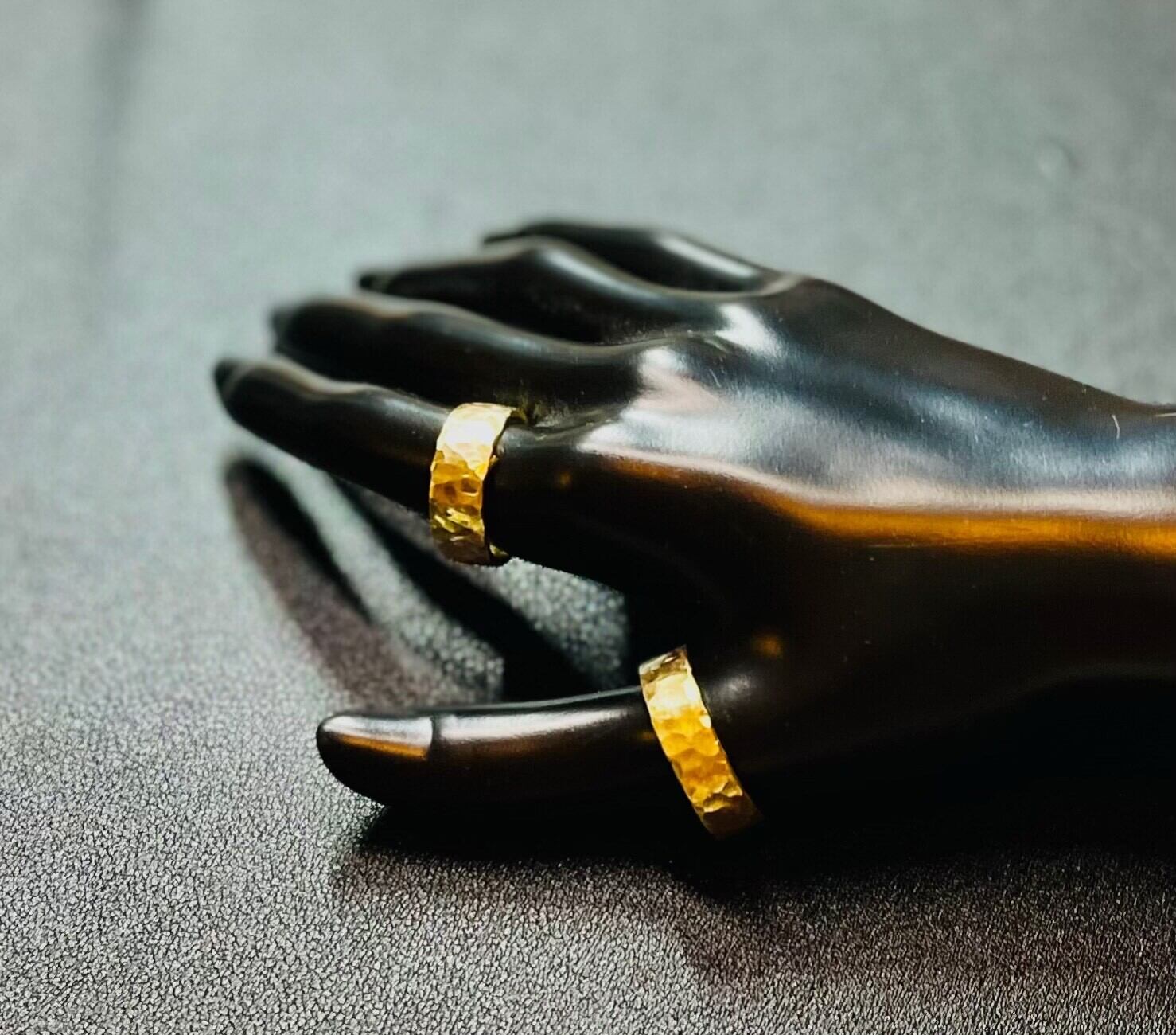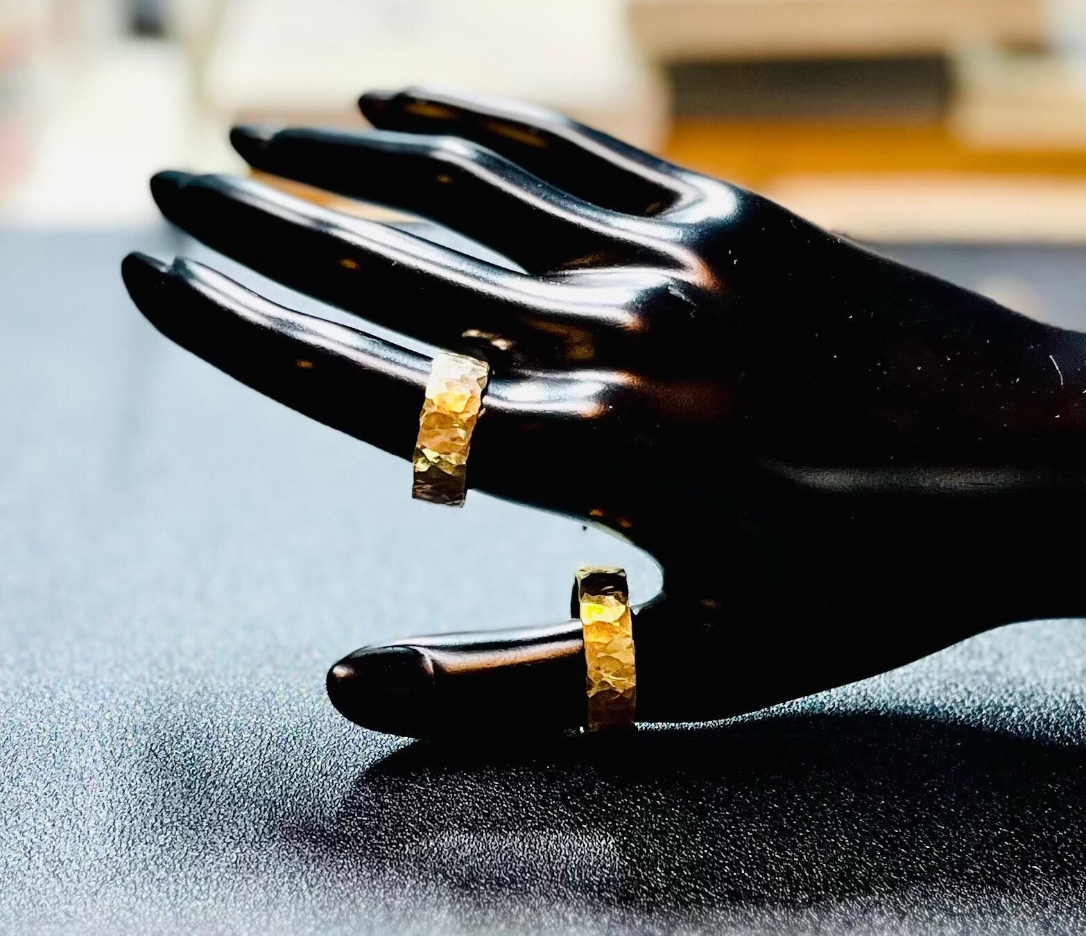 このリングは、太めのデザインなので、存在感がありながらもシンプルさを兼ね備えています。普段使いから特別な日のアクセサリーまで幅広く活用できます。槌目模様は見る角度によって印象が変わり、身につけるたびに新たな発見があります。