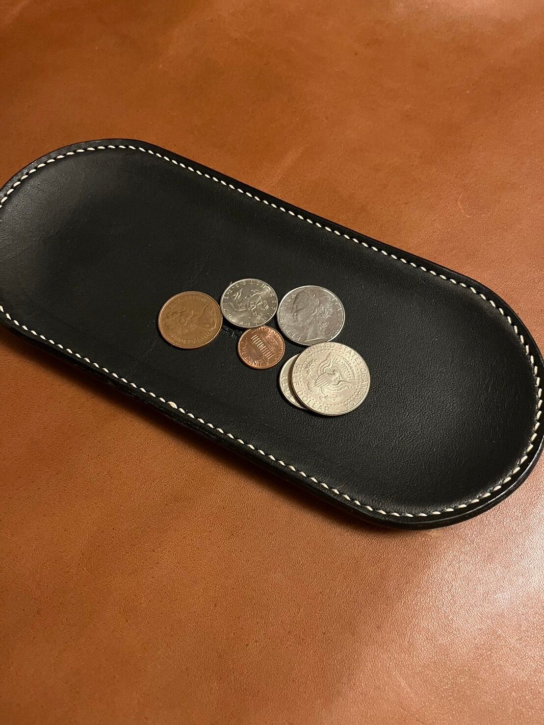 丈夫なステンレスを、肌触りの良いヌメ革で包んだこちらのトレイは、手縫いでしっかりと縫い込まれています。